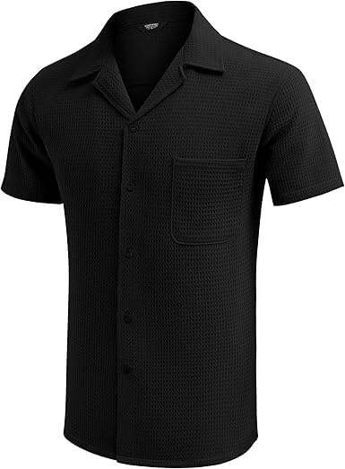 Men’s Waffle Shirt Button Down Short Sleeve Shirt Loose Fit Cuban Beach Tops